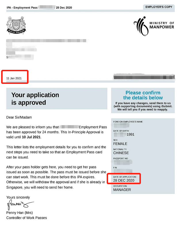 於2019年10月份初次接觸悅行國際,於2019年10月26日簽約。期間開始準備各種移民相關材料。2020年12月28日遞交申請,2021年1月11日獲批,中間補件一次,從遞交到獲批隻用兩周,一次性獲批兩年,IPA半年有效期,在2021年7月10之前登陸新加坡領卡即可。