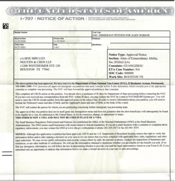 由於移民局對證據形式要求的嚴格程度不斷加深,該案收到針對獎項和媒體報道的補件。除按補件要求完善證據形式,悅行國際團隊進一步搜集瞭補強證據,並重點解釋瞭獲獎和媒體報道中的疑點, 最終順利獲批。本案成功的關鍵在於,本司律師團隊用細節和實例表明瞭客戶未來赴美計劃的切實可行性,未來對美國有切實的利益。W女士的優先日爲2020年11月25日,於2021年1月27日批準,曆史周期2個月。