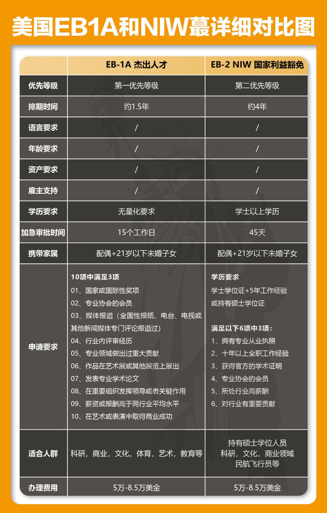 排期:EB1A是美國第一優先級的申請項目,排期最短的移民項目。 NIW屬於(yú)EB2分類,屬於(yú)第二優先,排期目前爲四年左右。 - 學曆:NIW要求需要大學本科以上學曆,EB1A對於(yú)學曆沒有明確(què)要求 - 評判标準:EB1A申請标...