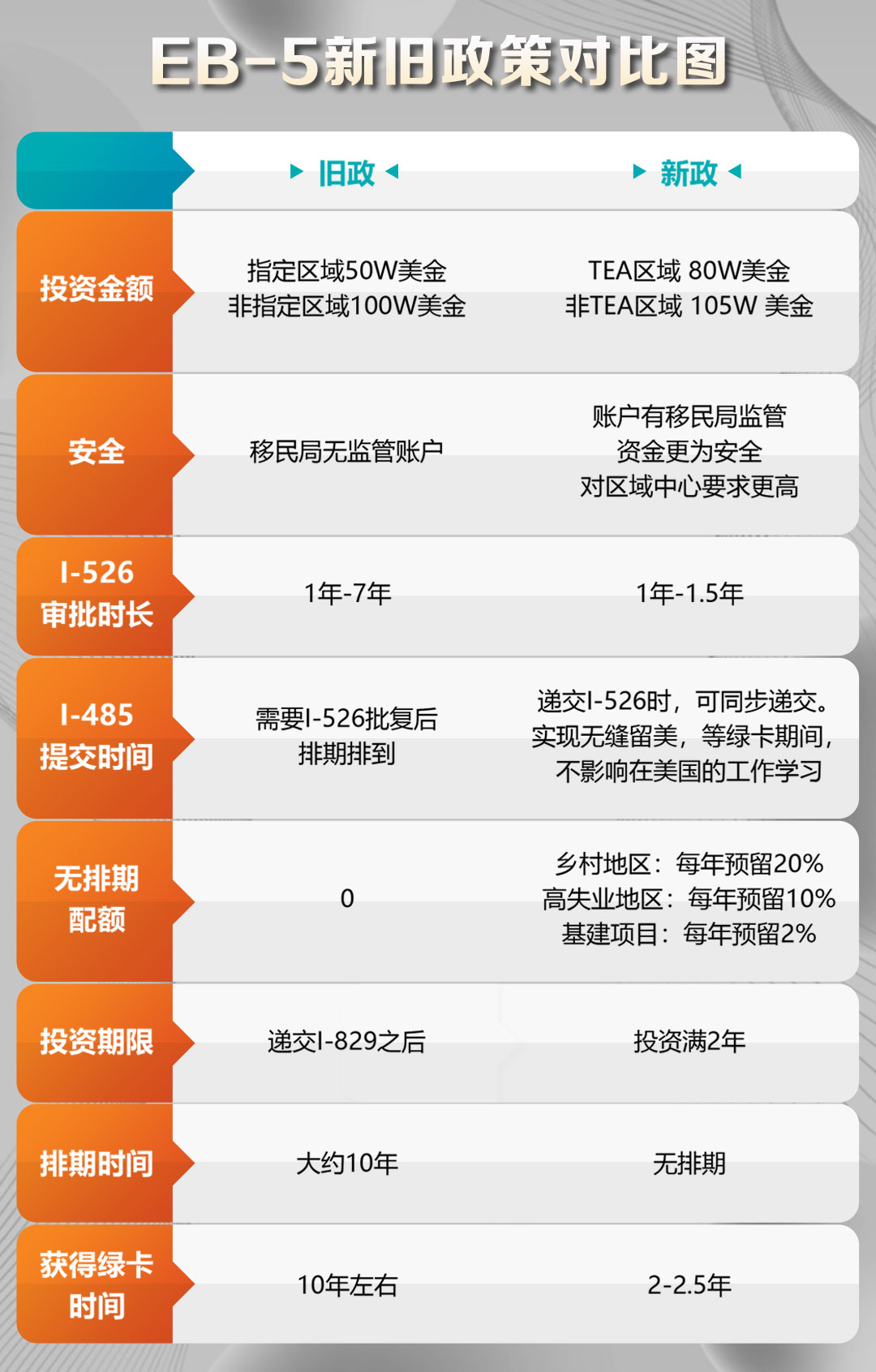 3. 想快速登錄美國的申請人:由於(yú)移民美國的申請人數日益增長,移民局案件積壓導緻排期。而新政下的EB5目前無排期,便成爲瞭(le)更多人的首選。