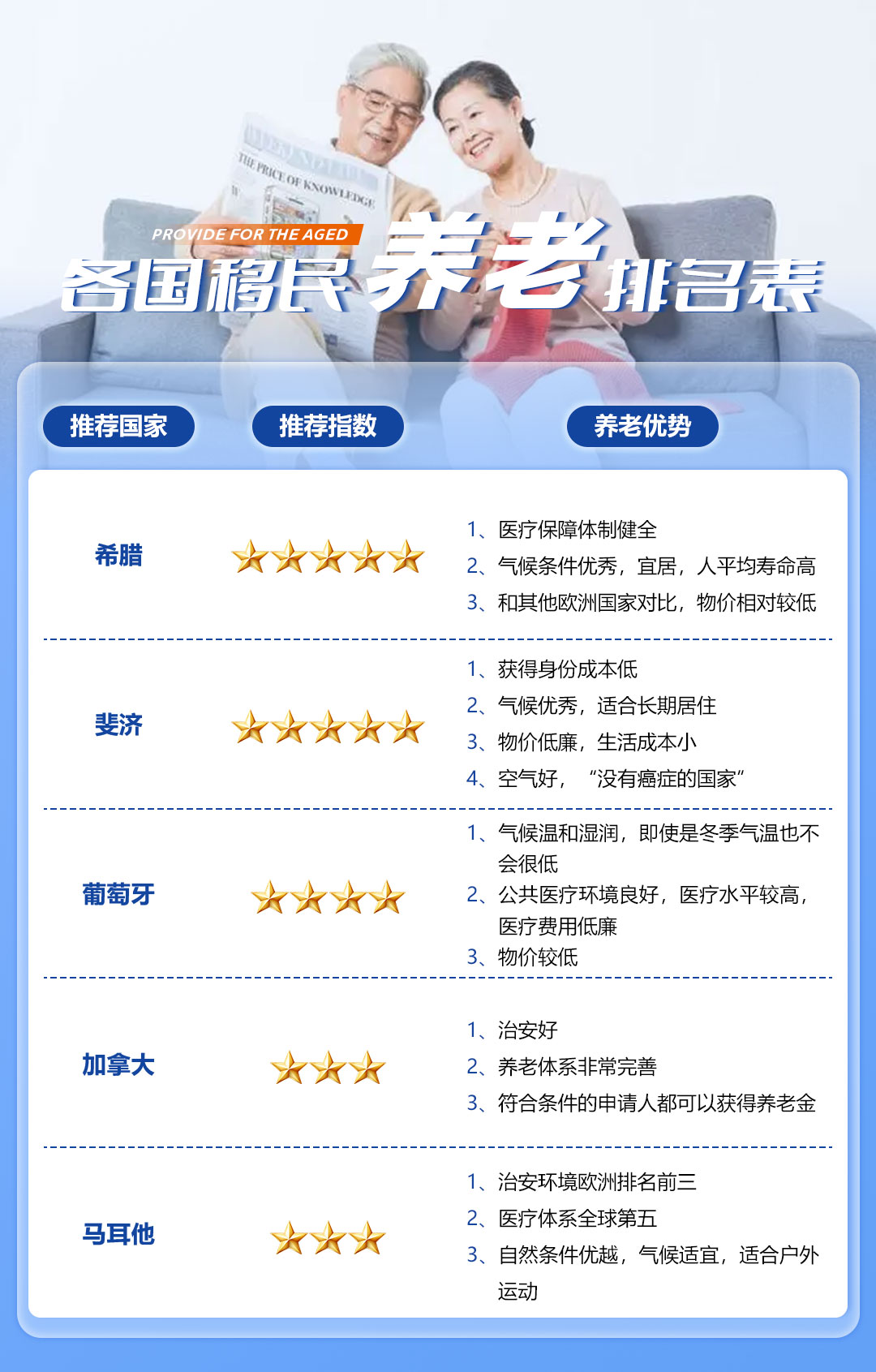 1. 希臘 :醫療保障體制健全,人平均壽命高。氣候條件優秀,宜居,和其他歐洲國家對(duì)比,物價相對(duì) 較低。 2. 斐濟 : 獲得身份成本低,氣候優秀适合長(zhǎng)期居住。物價低廉,生活成本小。 3. 葡萄牙:氣候溫和濕潤,即使是冬季氣溫也不會很低...