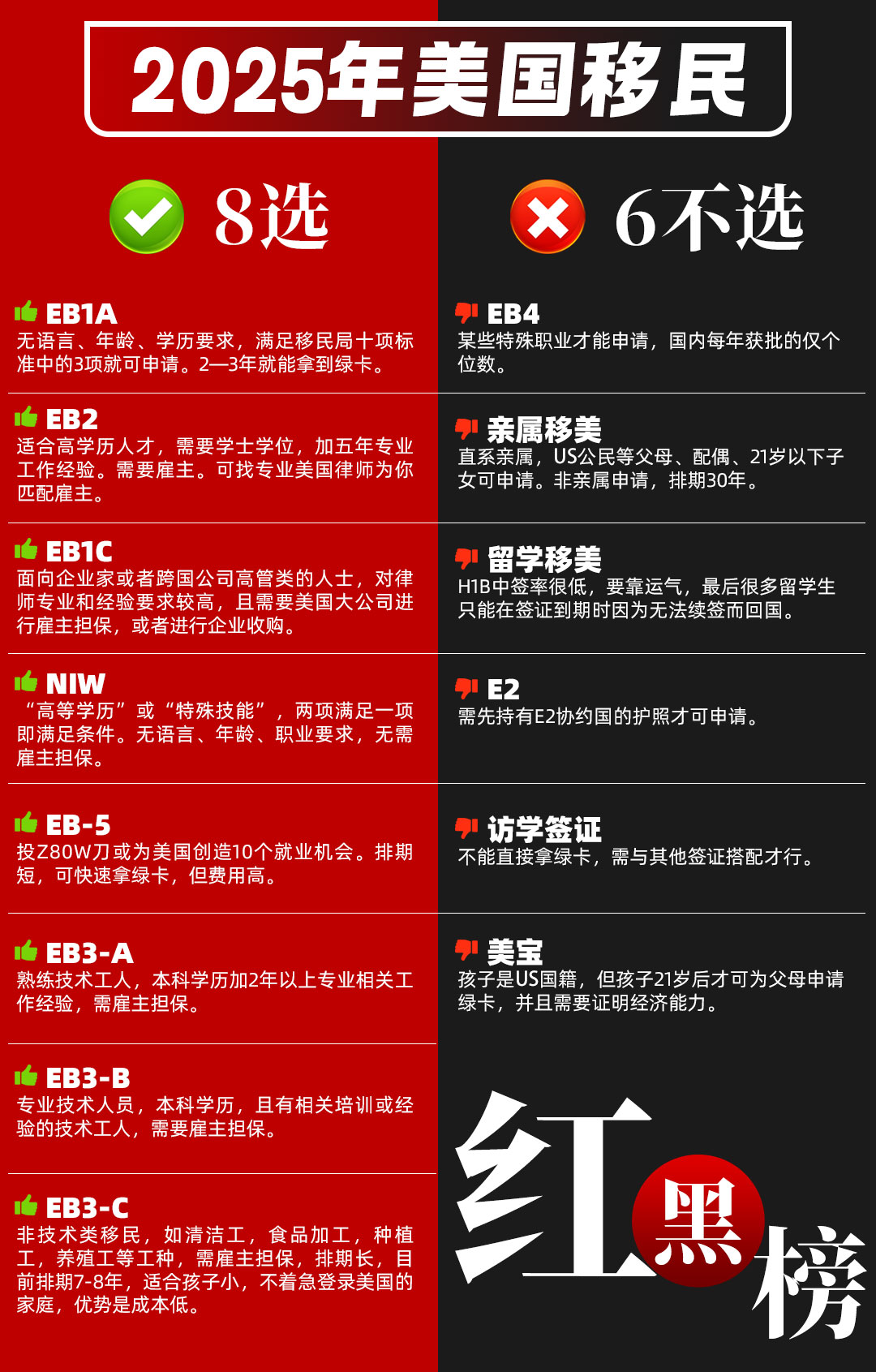 ❶EB1A ✅無語言、年齡、學曆要求,滿足移民局十項标準中的3項就可申請。2—3年就能拿到綠卡。 ❷EB2 ✅适合高學曆人才,需要學士學位,加五年專業工作經(jīng)驗。需要雇主。可找專業美國(guó)律師爲你匹配雇主。 ❸EB1C ✅面向...