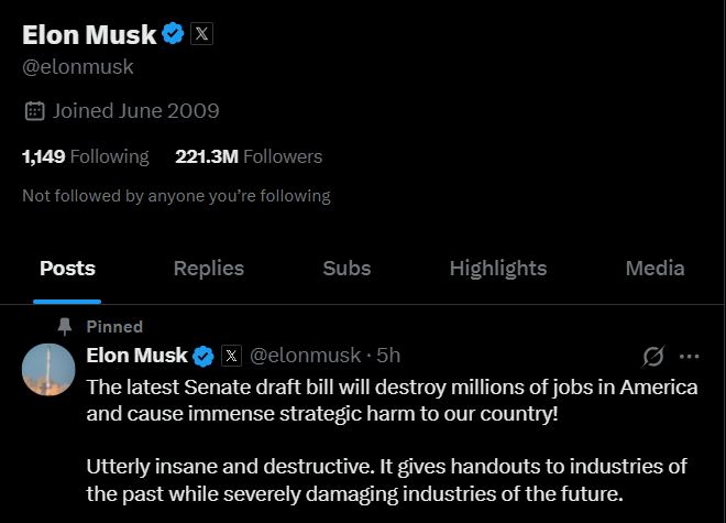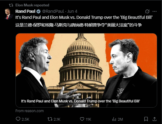 他強調:“大而美”法案将把聯邦債務上限再提高5萬億美元。今年一季度,美國陷入經濟負增長,36.1萬億美元債務上限也被突破,美國财政部動用非常規措施來借貸的能力可能會在8月中旬耗盡。他對法案的批評也是他與川普關系惡化的重要原因之一。
