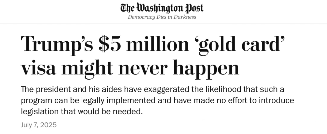 據《華盛頓郵報》報道,總統川普高調推出的500萬美元一張的“金卡”簽證計劃,正在受到移民律師和法律專家的普遍質疑。他們警告稱,該(gāi)計劃不僅可能非法,且在未獲國(guó)會批準的情況下,幾乎不可能付諸實施。