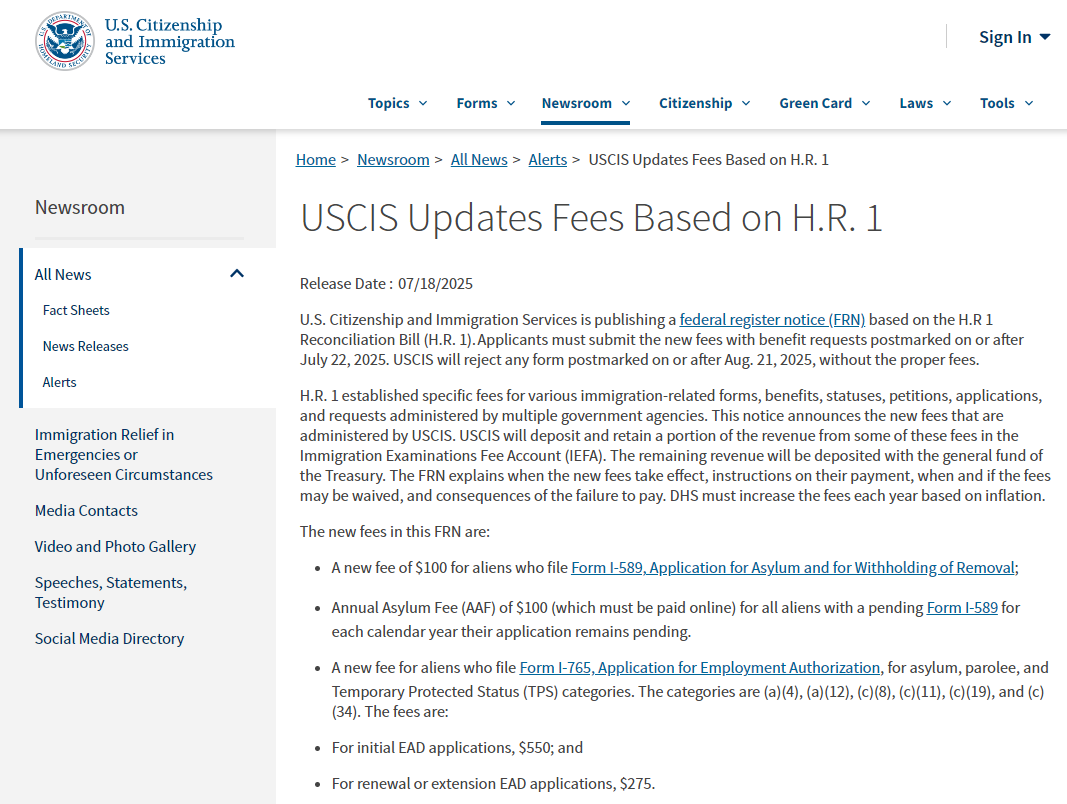 根據美國公民及移民服務局(USCIS)官網7月18日發布的消息,該部門依據《H.R.1預算協調(diào)法案》(H.R.1)現對(duì)多項移民相關申請費用進行調(diào)整。自2025年7月22日起,申請人在提交各類移民福利申請時,必須按照新規定繳納相關費用。USCIS将拒收任何在2025年8月21日或之後寄出的、未繳納新費用的申請。