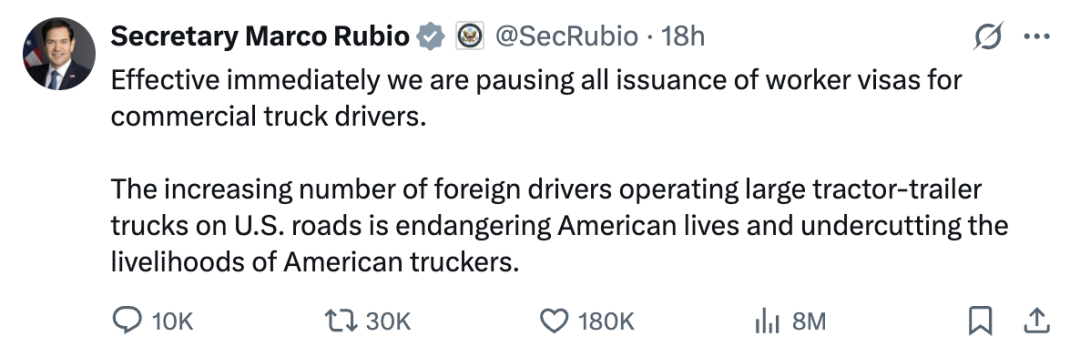 “外籍司機在美國道路上駕駛大型拖車卡車的數量日益增加,這不僅威脅到美國民衆的生命安全,還影響瞭(le)美國卡車司機的生計,”盧比奧(ào)在X社媒平台中寫道。