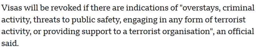 據美聯社報(bào)道,審查内容包括簽證持有人的“超期滞留、犯罪活動、對公共安全的威脅、參(cān)與任何形式的恐怖活動”等行爲。