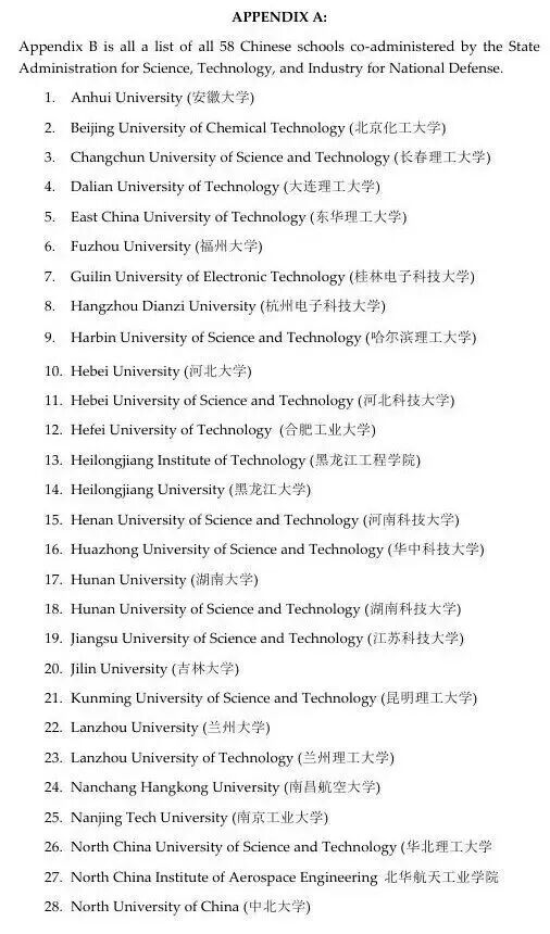 報告提出瞭多方面的限制建議,其中最引人注目之處,是它首次明確點名瞭58所與中國國家國防科技工業局(SASTIND)共建的中國高校,並将這些院校與已實施多年的“總統公告10043号”(PP10043)直接挂鈎。