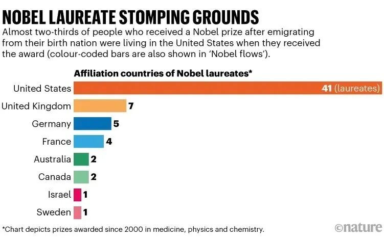 目前,美國依然是科研人才的集中目的地。21世紀以來,63位“移民諾獎得主”中有41位定居美國。第二受歡迎的目的地是英國,有7位移民科學家在接到來自斯德哥爾摩的電話時居住在那裏。