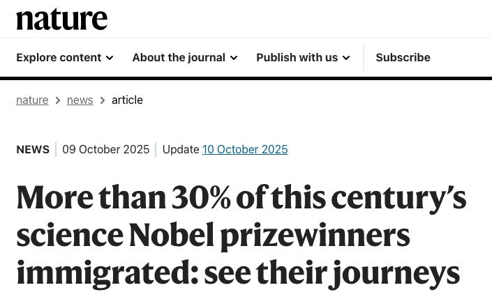 10月9日,國際頂級學術期刊《Nature》發表瞭(le)一篇題爲《移民如何重塑諾貝(bèi)爾獎版圖》(How Immigrants Are Reshaping the Nobel Landscape)的文章,引發廣泛熱議。