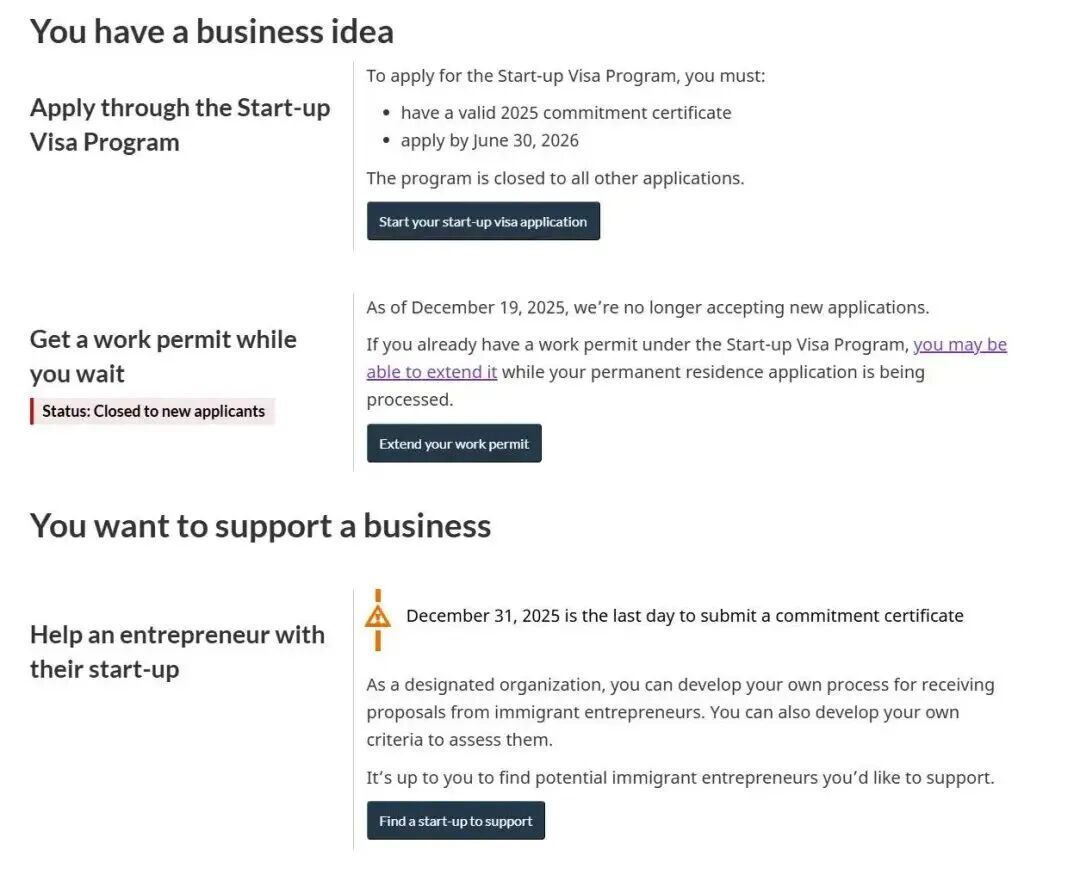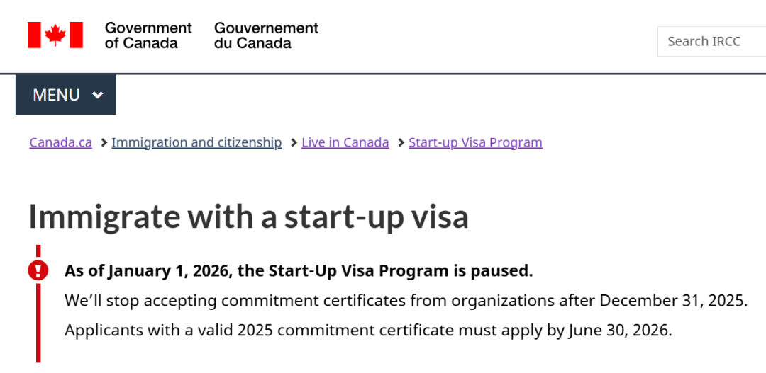 12月19日,加拿大移民、難民和公民部(IRCC)更新信息:自2026年1月1日起,全面暫停接受聯邦創(chuàng)業簽證(Start-Up Visa,簡稱(chēng)SUV)永居項目的新申請。