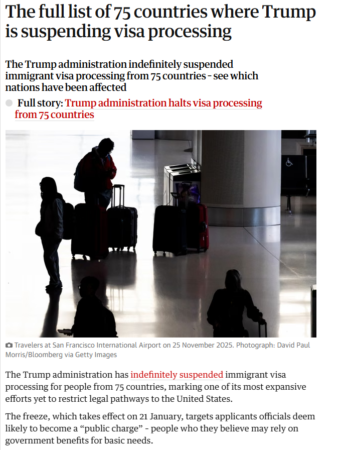 政策将於1月21日正式生效,且未設定結束時間。官方态度堅決,表示隻有在完成對簽證審查程序的“全面重新評估”後,才會考慮解除暫停。