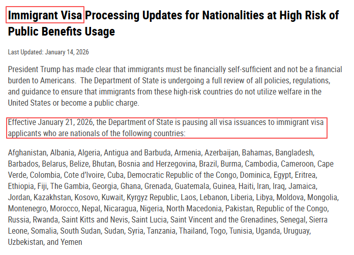 2026年1月14日,美國國務院宣布瞭一項重大移民政策變動,将從(cóng)2026年1月21日開始,暫停受理來自75個(gè)國家/地區的移民簽證申請。