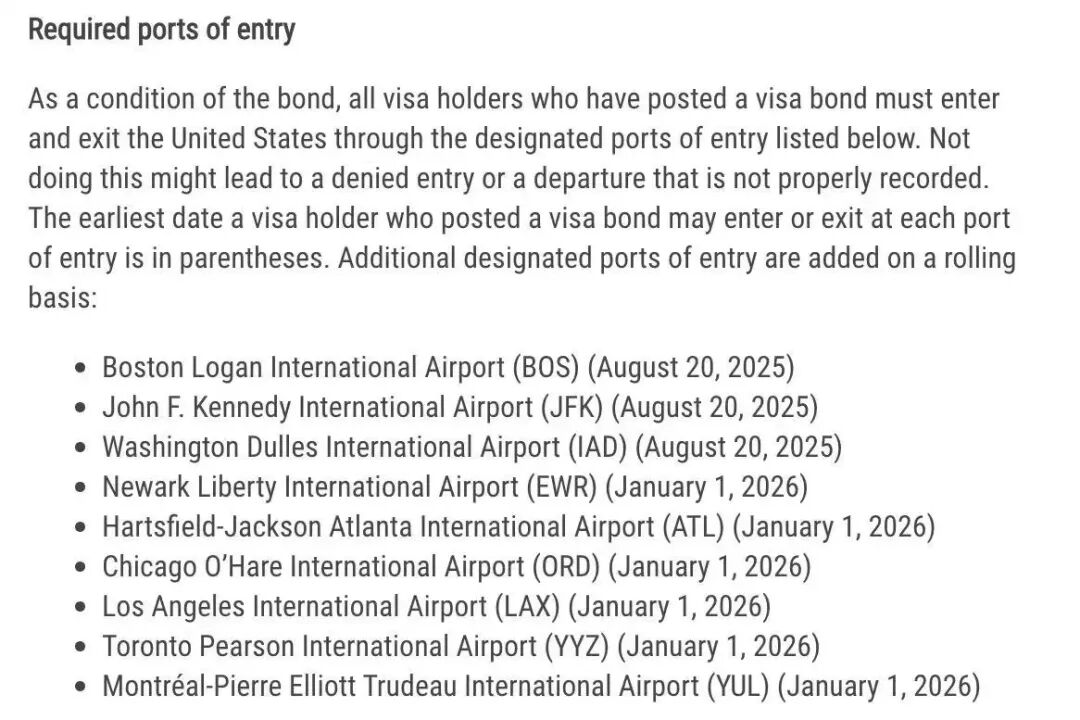 這意味著(zhe),部分持B1/B2訪問簽證、並(bìng)被要求繳納簽證保證金的旅客,今後必須且隻能通過指定機場進出美國。一旦違規,輕則入境受阻,重則留下不良記錄,直接影響未來簽證申請。