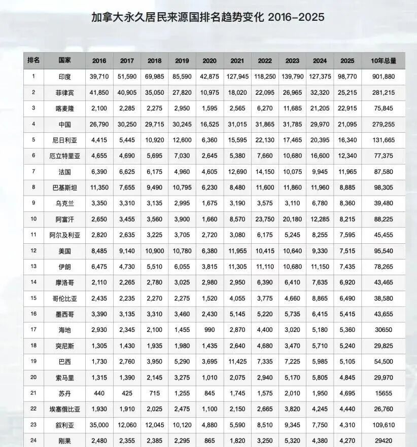 加拿大永久居民來源國排名趨勢變(biàn)化 2016-2025,中國則呈現緩慢回落趨勢,從長(zhǎng)期位居第二、第三,下降至2025年的第四位。 印度已連續多年穩居加拿大永久居民(PR)第一大來源國,占比超四分之一,2024年以來,每4個新移民中就有1個來自印度。而中國則從過去的第一梯隊滑落至第四,十年間中印差距從 “旗鼓相當” 擴大到三倍以上。