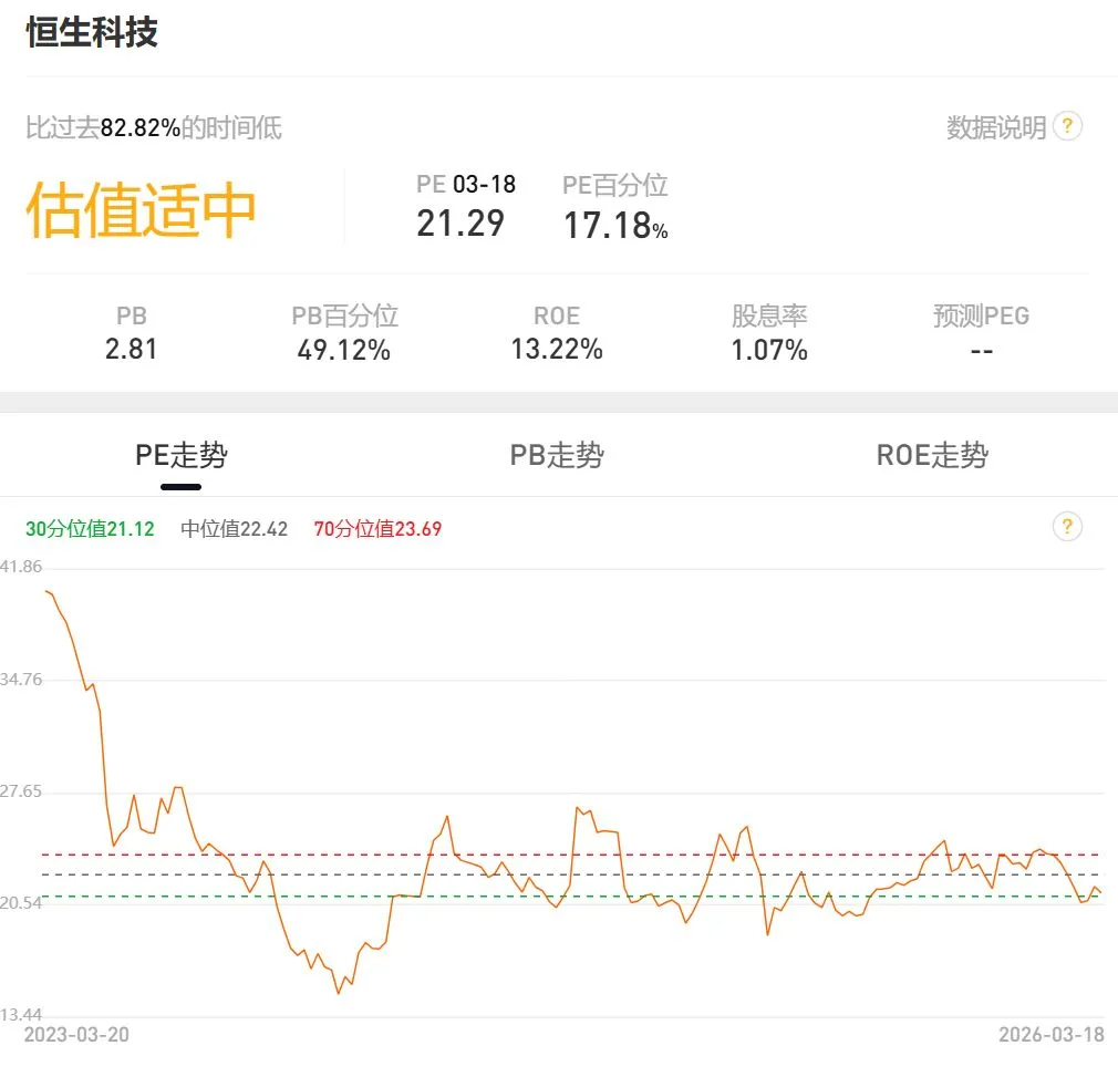 截至 2026 年 3 月 13 日,恒生科技指數的市盈率隻有 21.21 倍,遠低於(yú)納斯達克 100 的 33 倍和 A 股創業闆指的 41 倍,是不折不扣的“全球最便宜的科技資産(chǎn)”。