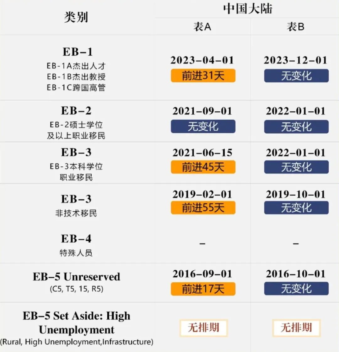 · EB-1:表A前進(jìn)31天,目前在2023年4月1日;表B無變(biàn)化,維持在2023年12月1日;